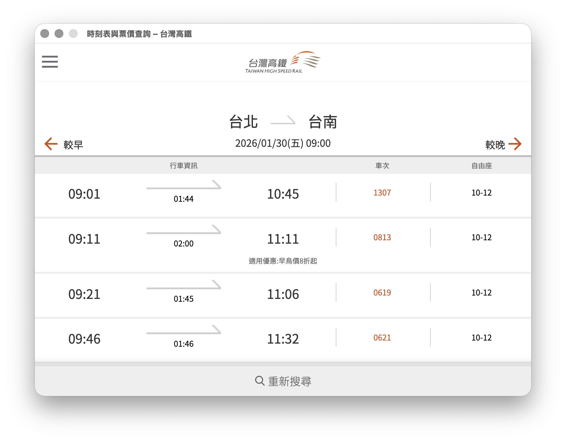 以這個查詢高鐵班車時刻為例,查詢網頁預設從「南港」出發抵達「左營」,日期是 2026/01/26,時間為 20:30。