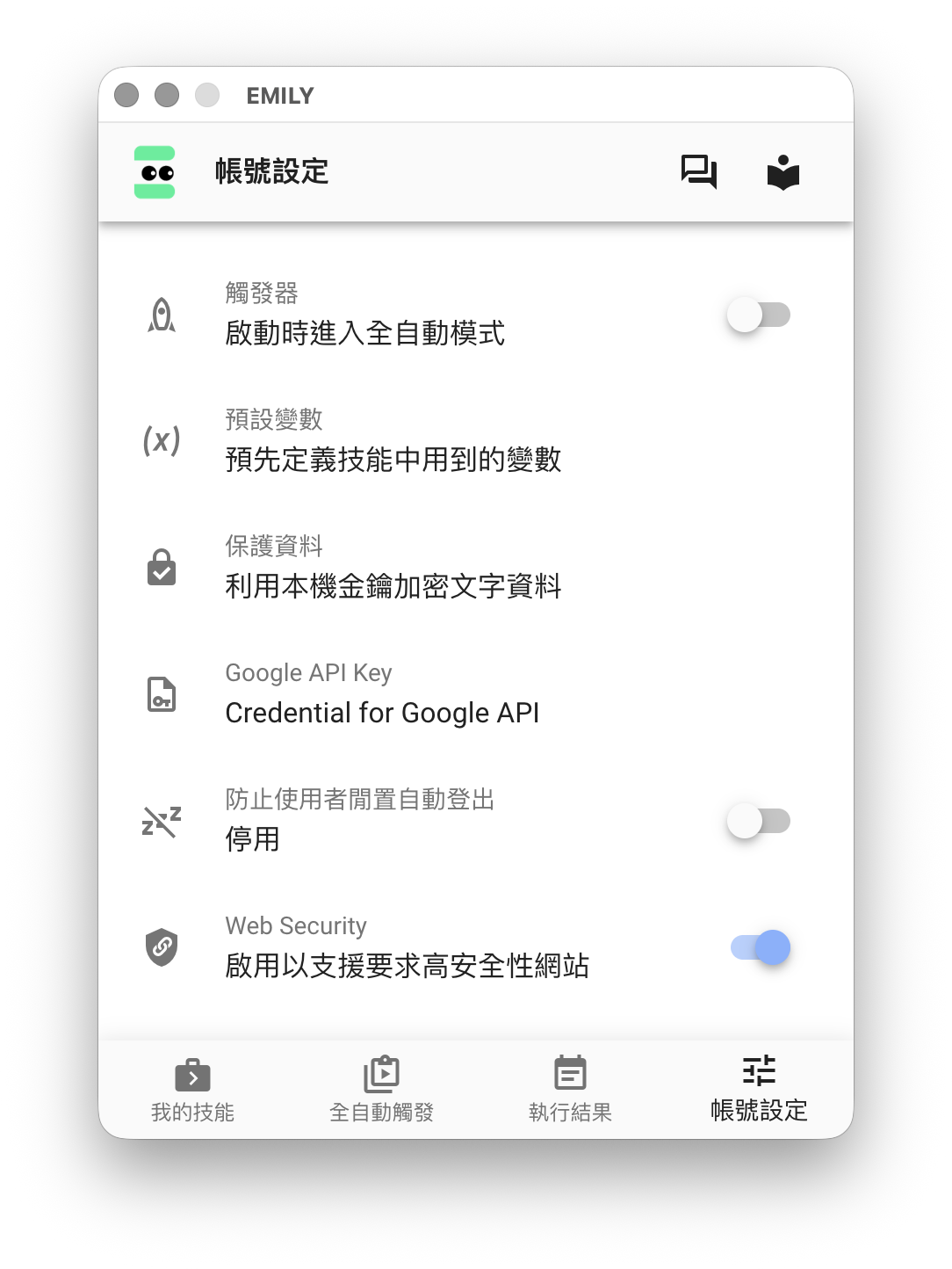 觸發器「啟動時進入全自動模式」開關打開後下次啟動 EMILY.RPA 就會直接進入全自動模式,配合作業系統的「開機自動登入」與「啟動執行應用程式」設定可以達成一開機就讓 EMILY.RPA 全自動的目標。