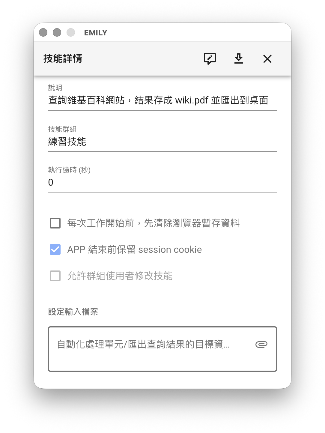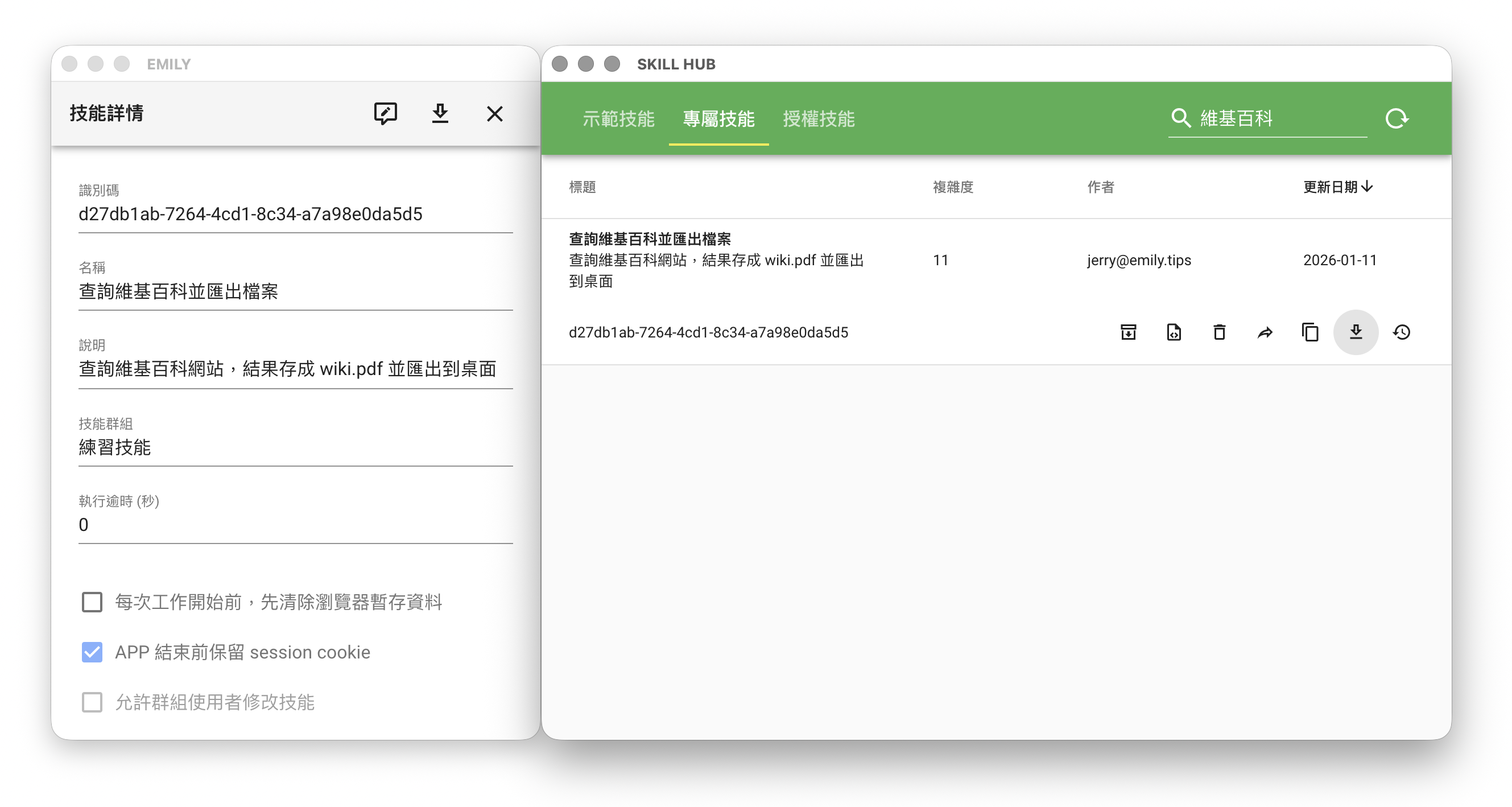 以「前往網址」這個指令來說,技能中會紀錄「前往網址」這個指令與 https://www.wikipedia.org/ 這個參數;又例如「鍵盤輸入」這個指令在技能中會紀錄「鍵盤輸入」這個指令與 world wide web 這個文字字串參數。因此當技能設計結束點擊「上傳」時,EMILY.RPA 會將這些指令與參數的序列傳送到使用者帳號的「雲端技能庫 SKILL HUB」備份起來,讓使用者未來可以下載與執行,而不必擔心本地軟體移除或電腦重灌造成「技能」遺失的問題,甚至可以讓使用者換一台電腦來執行技能。
