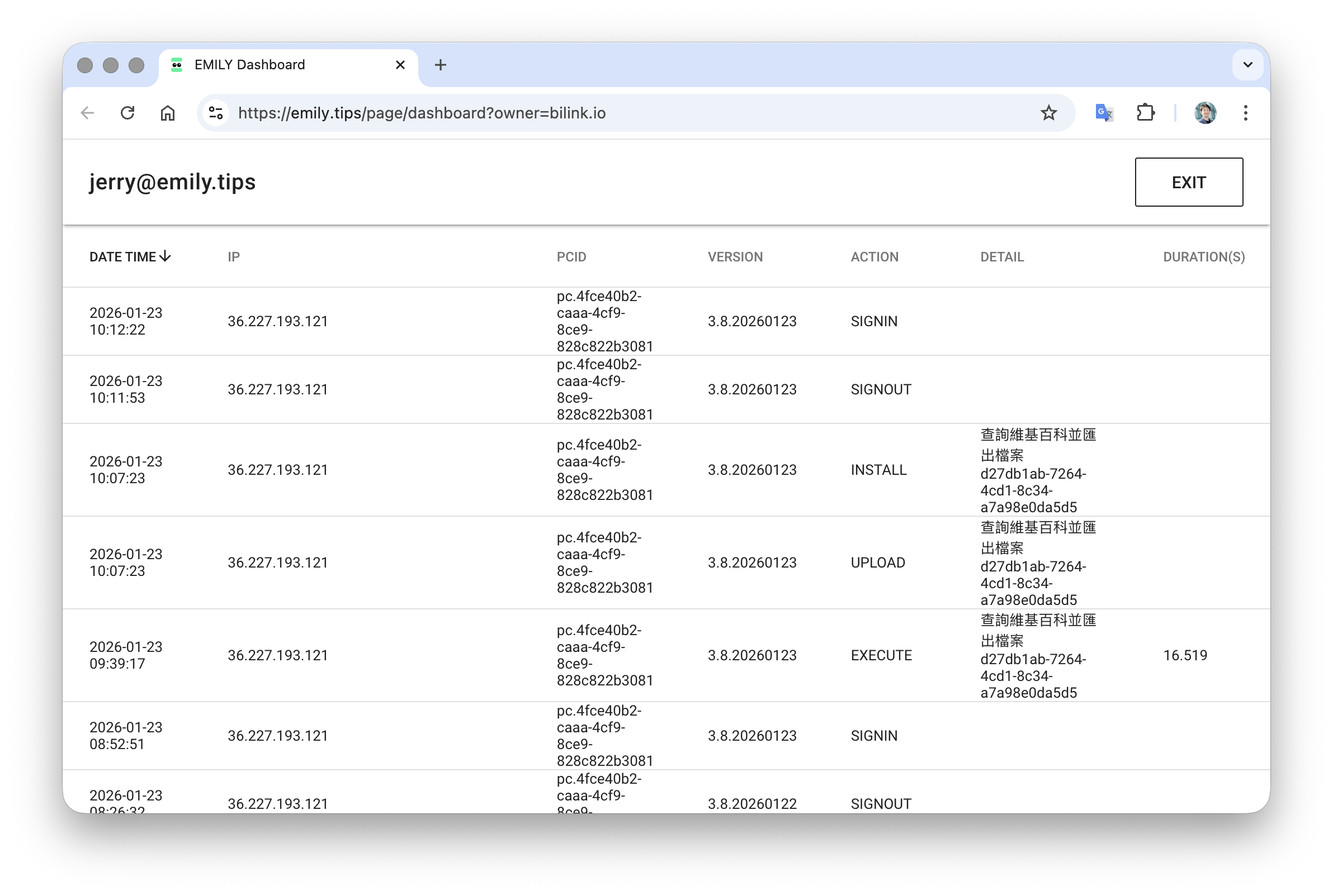 使用 EMILY.RPA 軟體與執行技能的時間記錄會保存在雲端,供企業方案的群組管理後台稽核使用。這些使用存取紀錄會保存一年,過期資料會逐步銷毀。