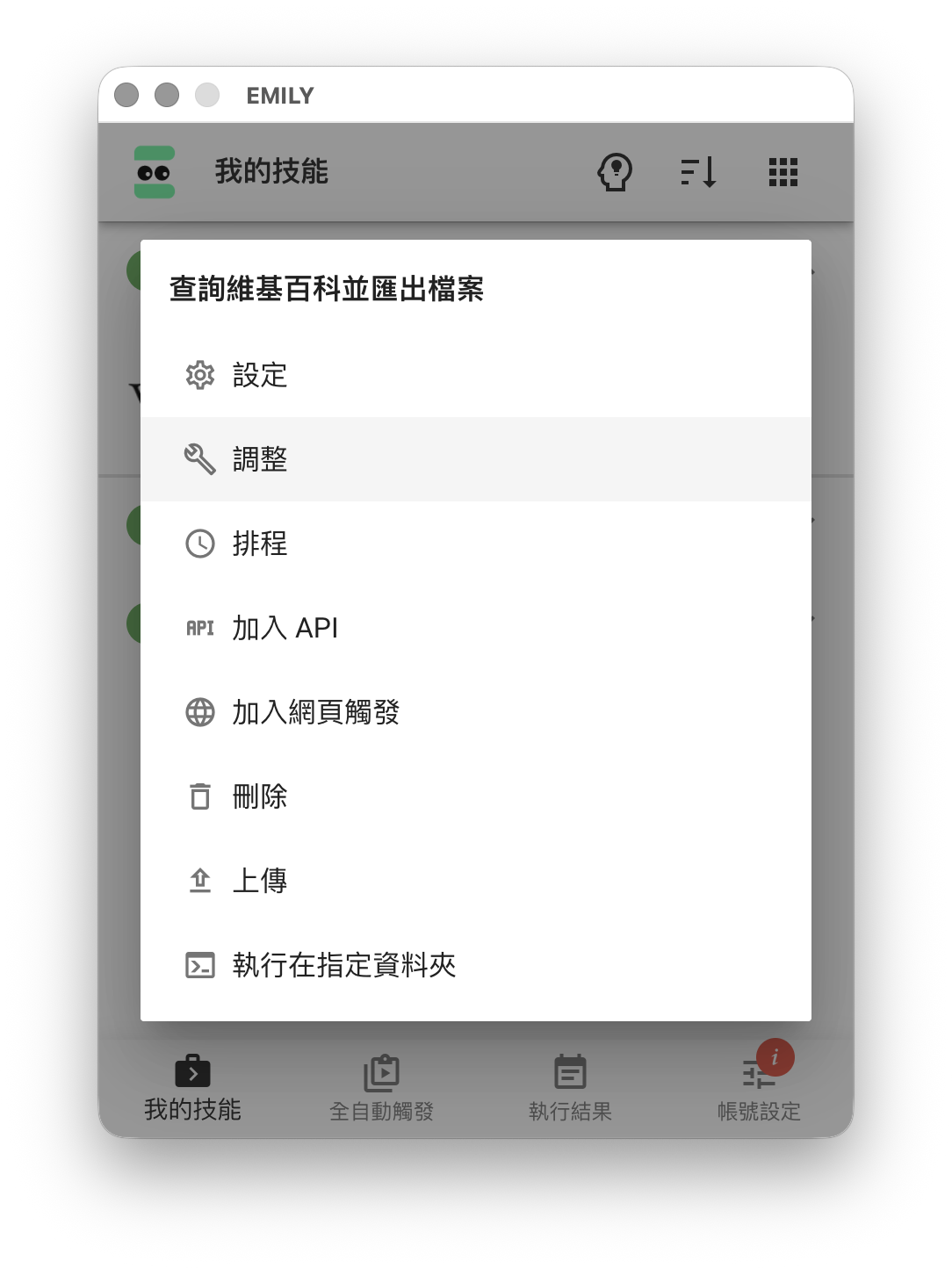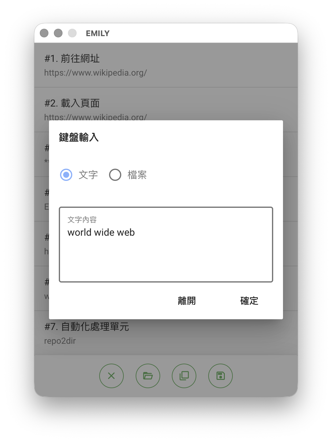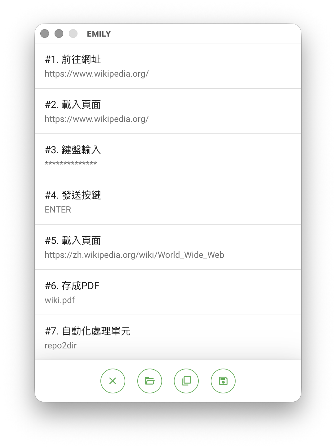 EMILY.RPA 的「技能」主要是由流程操作步驟的序列構成,例如到 www.wikipedia.org 搜尋關鍵字然後下載搜尋結果並存成 PDF 檔這個簡單例子,就會是這些步驟的序列:「前往 wikipedia」、「載入 wikipedia」、「輸入關鍵字」、「按下 ENTER」、「載入搜尋結果頁」、「將結果存檔」、「匯出檔案」。