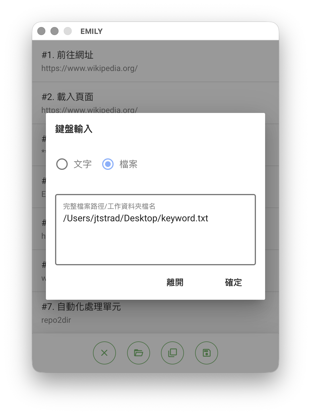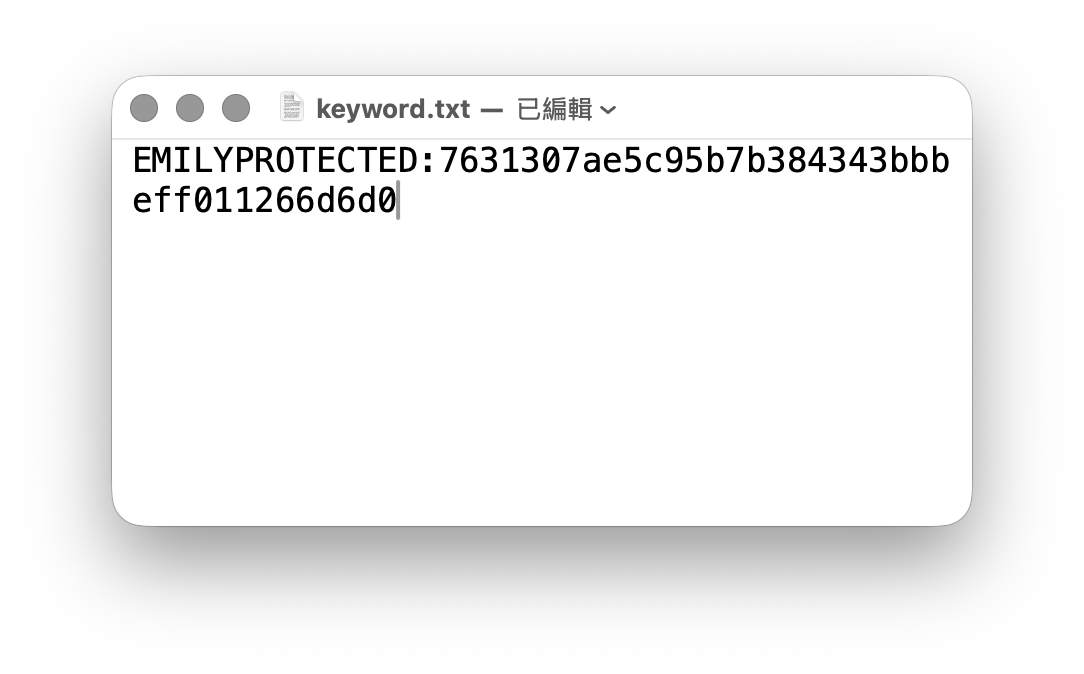 這樣在本機「儲存」成參數檔 keyword.txt 時,就會以這台電腦為 EMILY.RPA 提供的加密金鑰加密起來,只有 EMILY.RPA 可以在讀取時解密回原文。