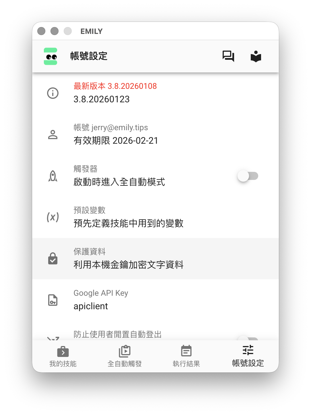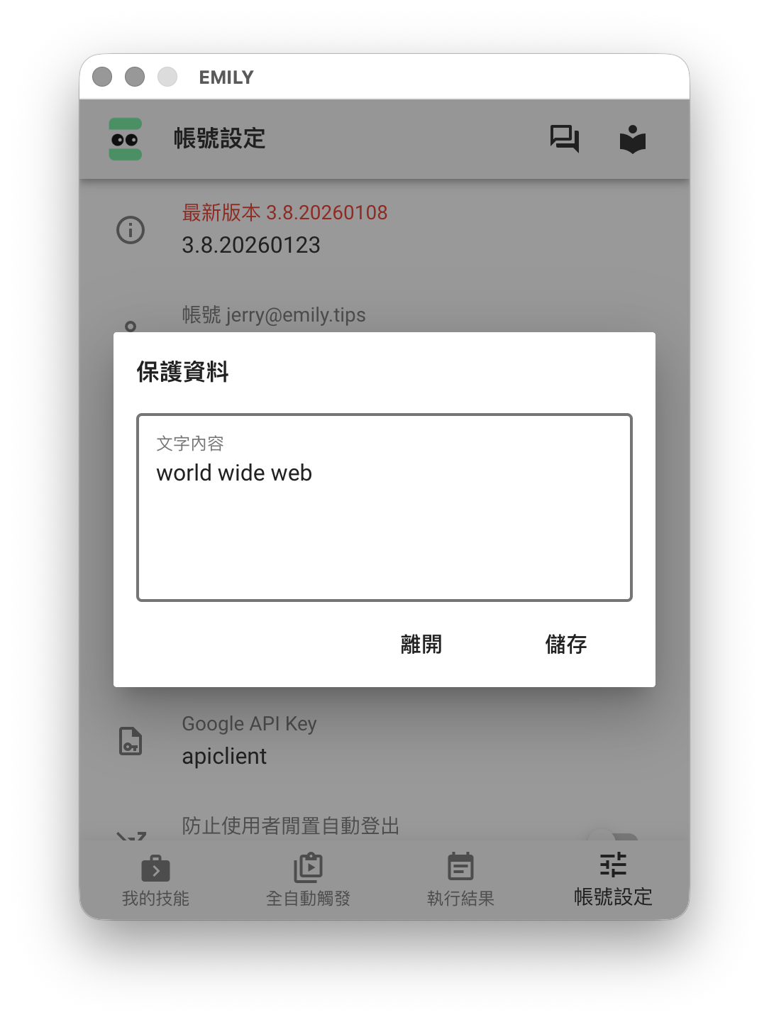 隔離指令參數成本機檔案後,雖然資料不會上傳雲端,但是參數檔仍然很容易暴露給可以存取這台電腦的其他人,因此 EMILY.RPA 提供加密功能,點擊「帳號設定」裡的「保護資料」,將要保護的關鍵字內容加密起來。