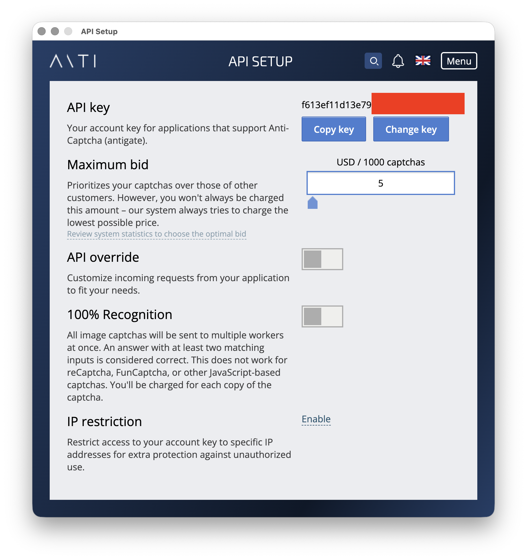 API KEY - 在 anti-captcha.com 申請的金鑰。