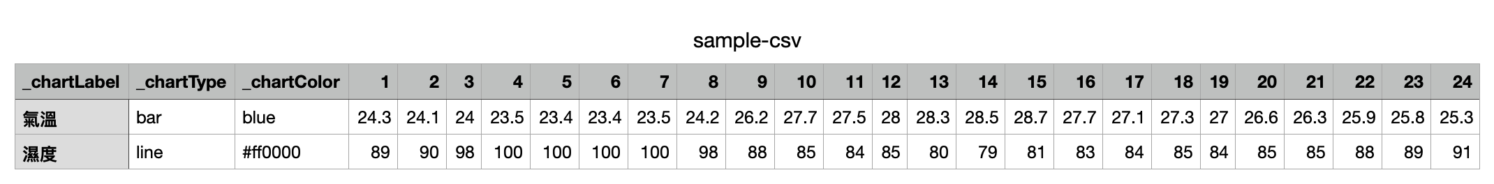 Chart 模組在解析 CSV 資料時,一般欄位表頭將用來繪製圖表的橫軸座標,每一資料列相對應欄位表頭的數值則用來繪製圖表的縱軸座標,請注意只有數值型別的資料才會被用來繪製圖表,其他型別例如文字將被忽略。而 _chart 為字首的特殊欄位表頭將被模組視為圖表設定參數,例如: