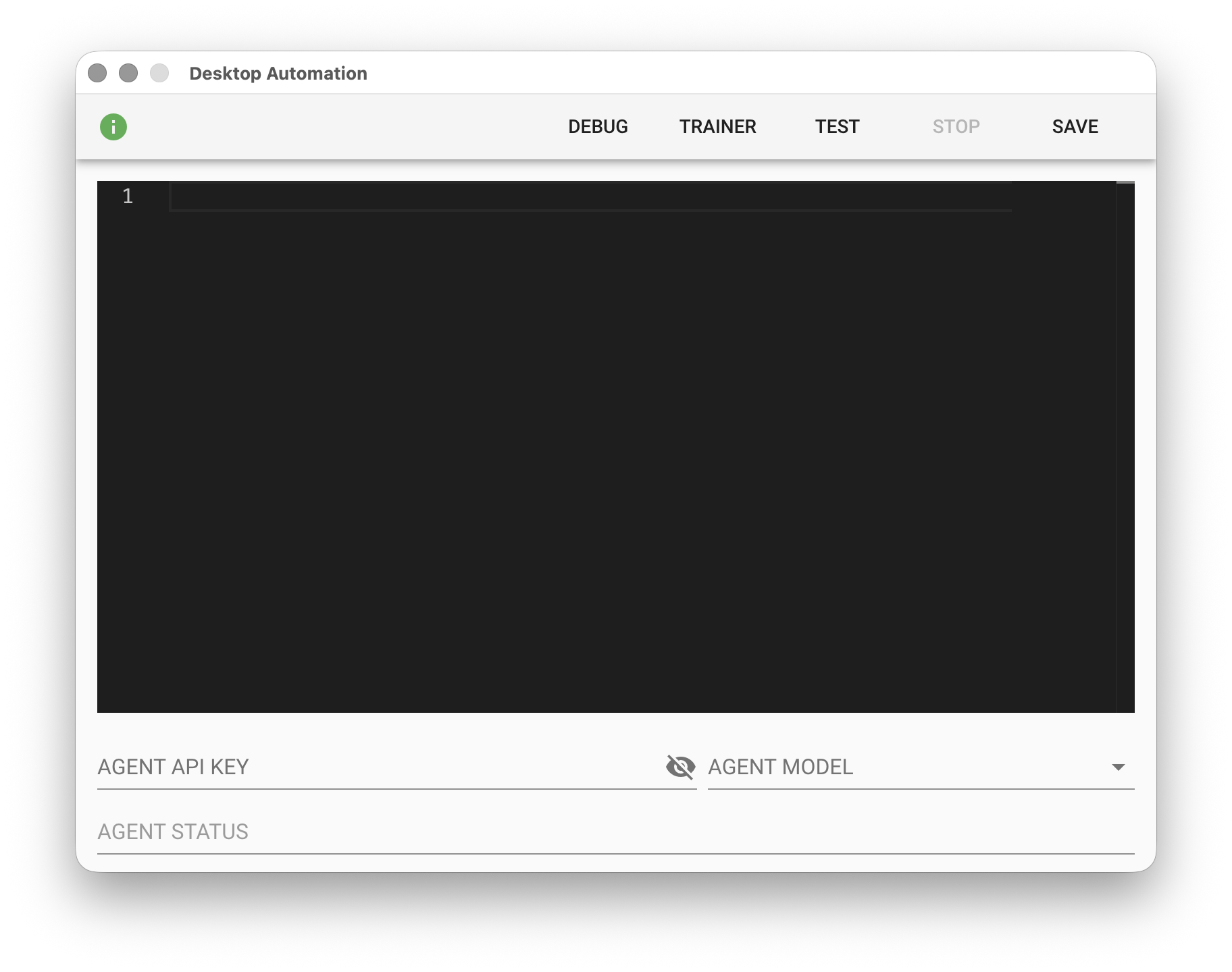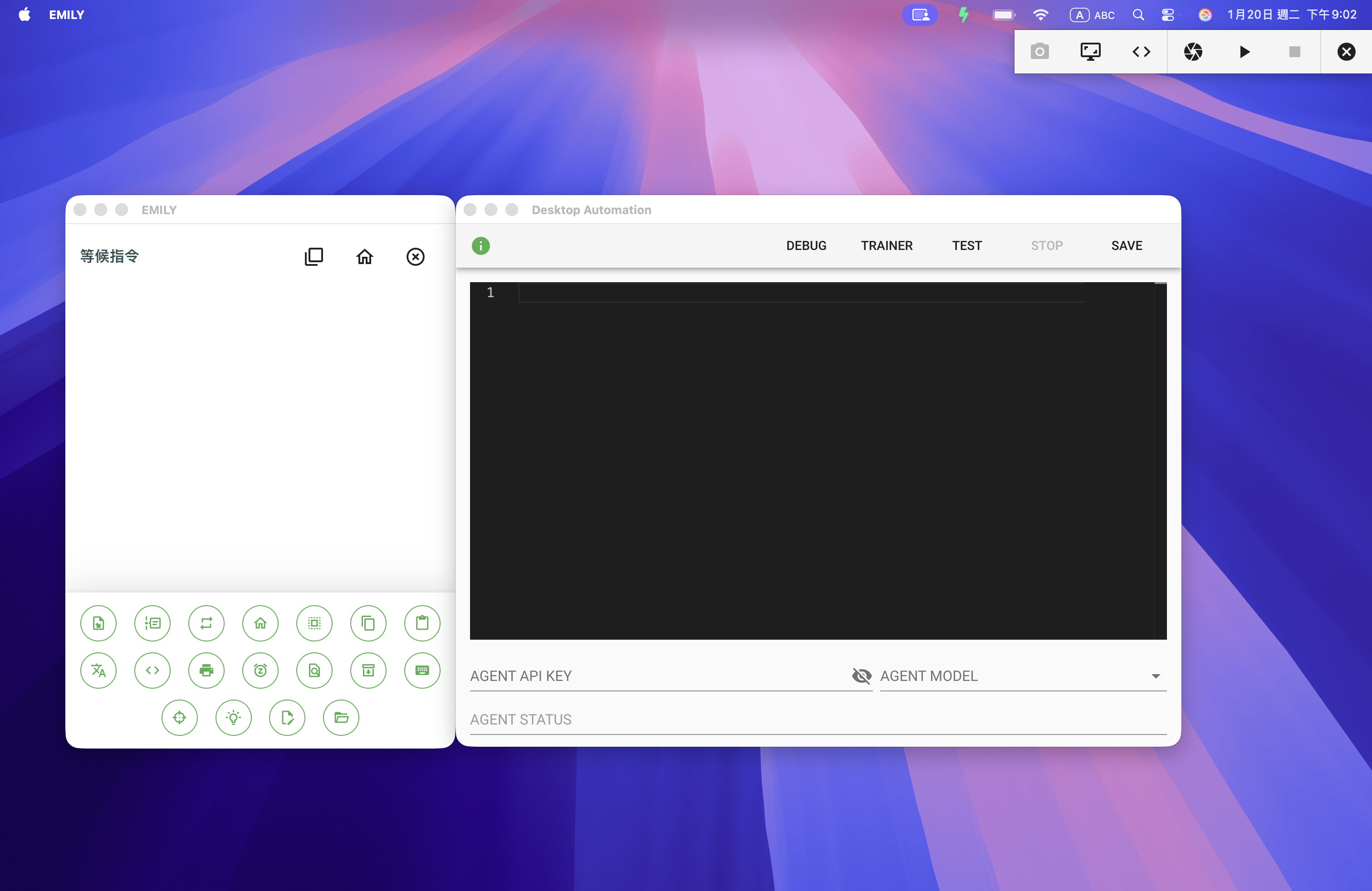 點擊「TRAINER」可以啟動在桌面右上方的訓練面板,直接在本機進行桌面流程設計。當訓練面板出現後,建議將主界面與模組視窗最小化,這樣可以將空間騰出給訓練面板使用。