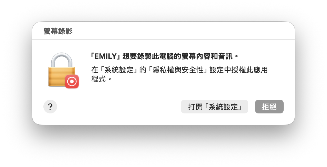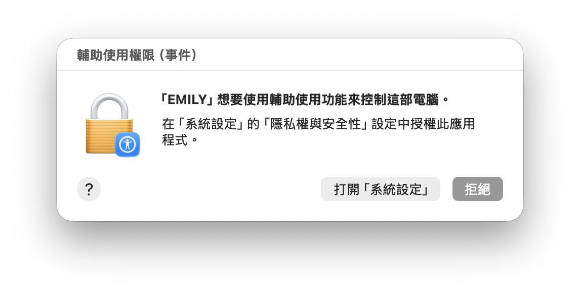 由於需要分析螢幕,因此第一次打開這個模組時使用者需要同意「螢幕錄影」的權限;另外需要控制滑鼠與鍵盤因此使用者也要同意「輔助使用」相關的權限。