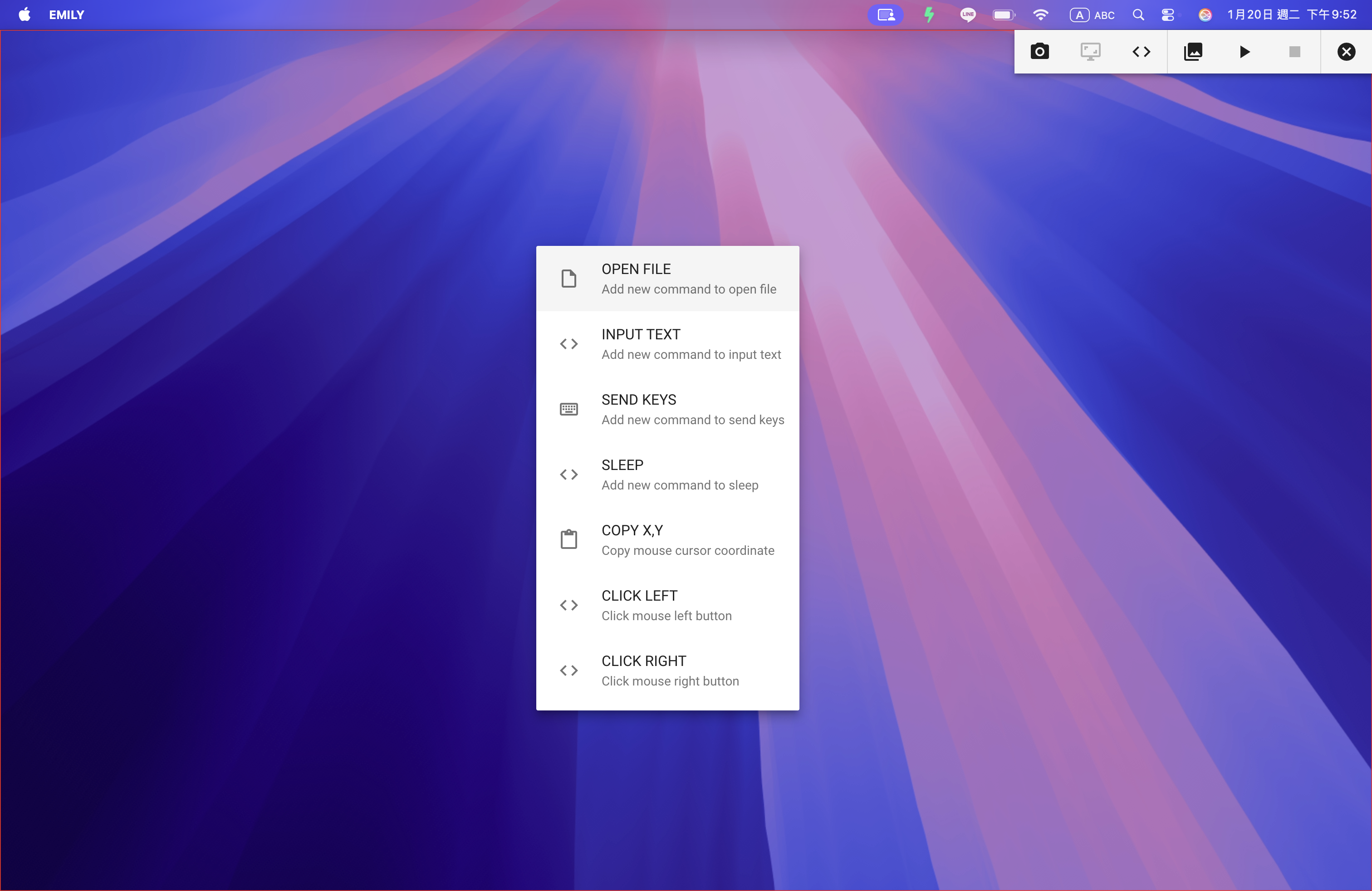 選單指令包含:OPEN FILE、INPUT TEXT、SEND KEYS、SLEEP、COPY XY、CLICK LEFT、CLICK RIGHT 等。其中 OPEN FILE 除了可以如同滑鼠雙擊指定檔案以啟動關聯的應用程式外,也可以選擇應用程式執行檔直接啟動應用程式。