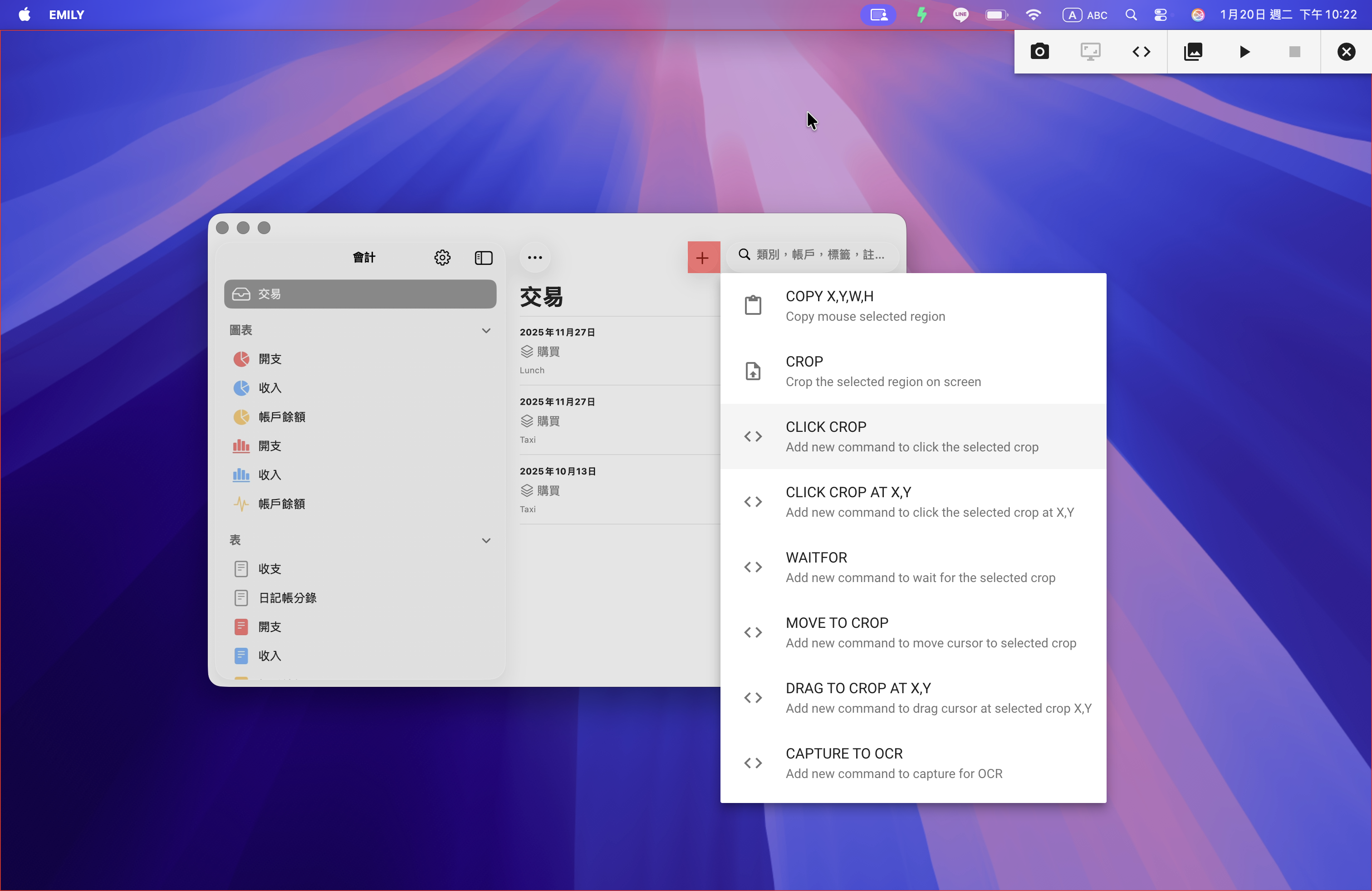 接著可以執行一次快照,取得最新螢幕畫面後切換回 No-Code 編輯器,繼續增加下一個指令,以滑鼠拖曳螢幕畫面上的按鈕區域,放開滑鼠後帶出指令選單,選取「CLICK CROP」增加指令,這個指令是讓 EMILY.RPA 在螢幕找到選取的參考圖案(CROP)再進行滑鼠點擊。需要找到螢幕上指定圖案的指令都會產生參考圖案在工作資料夾,檔案命名形式為 CROP-xxx.png。