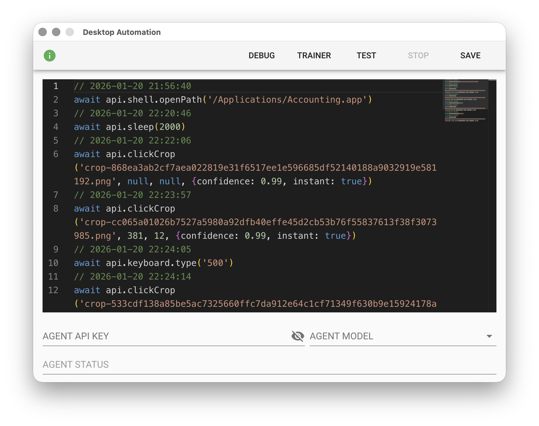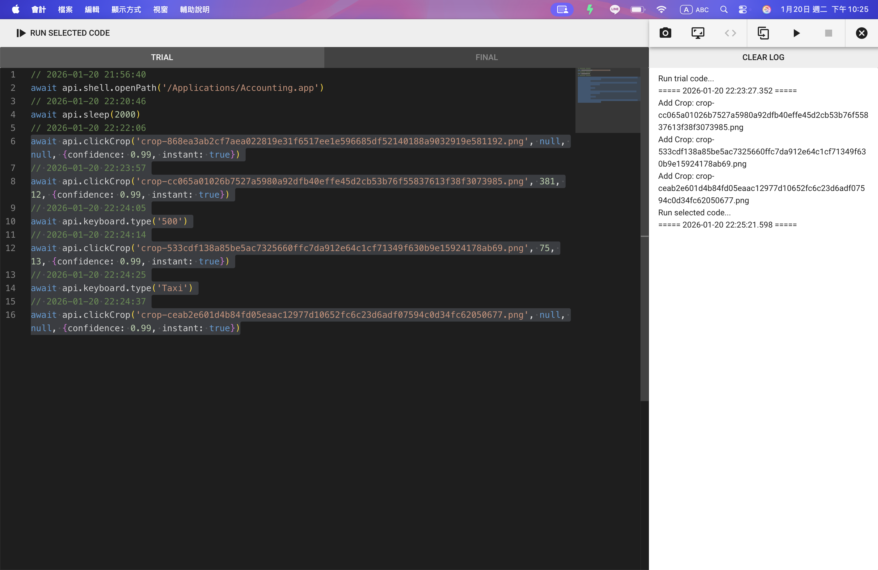 最後按下「SAVE」 才算完成桌面自動化並儲存。如果萬一忘了儲存,可以打開訓練模式的工作資料夾,剛才在 FINAL 區的程式碼會被儲存在 code-final-xxxx.js 的檔案中: