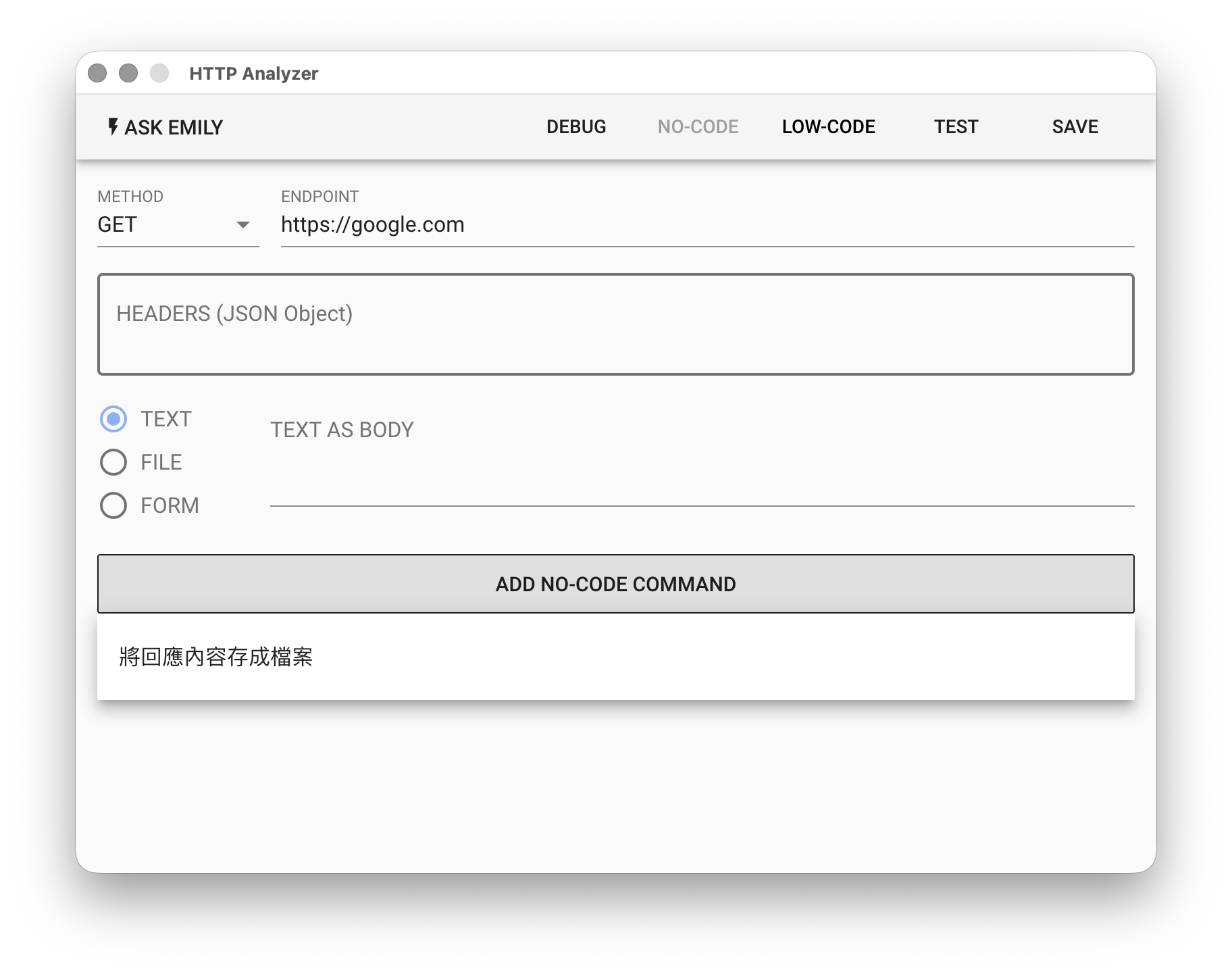 提供:「將回應內容存成檔案」等無程式碼指令。例如,「將回應內容存成檔案」可將回應的 url、status、headers、contentType、body 寫入工作資料夾中的文檔。