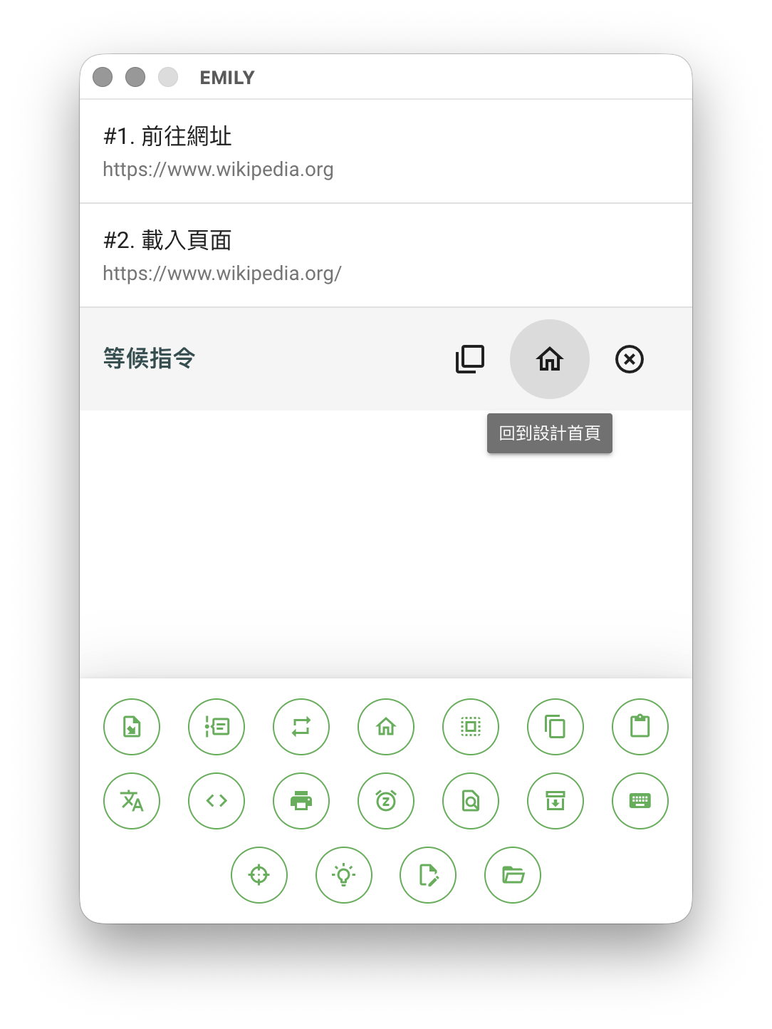 EMILY.RPA 提供多種自動化模組讓使用者在設計技能時可以按需求選用並加入流程。在訓練模式下點擊主界面的「回到設計首頁」按鈕。