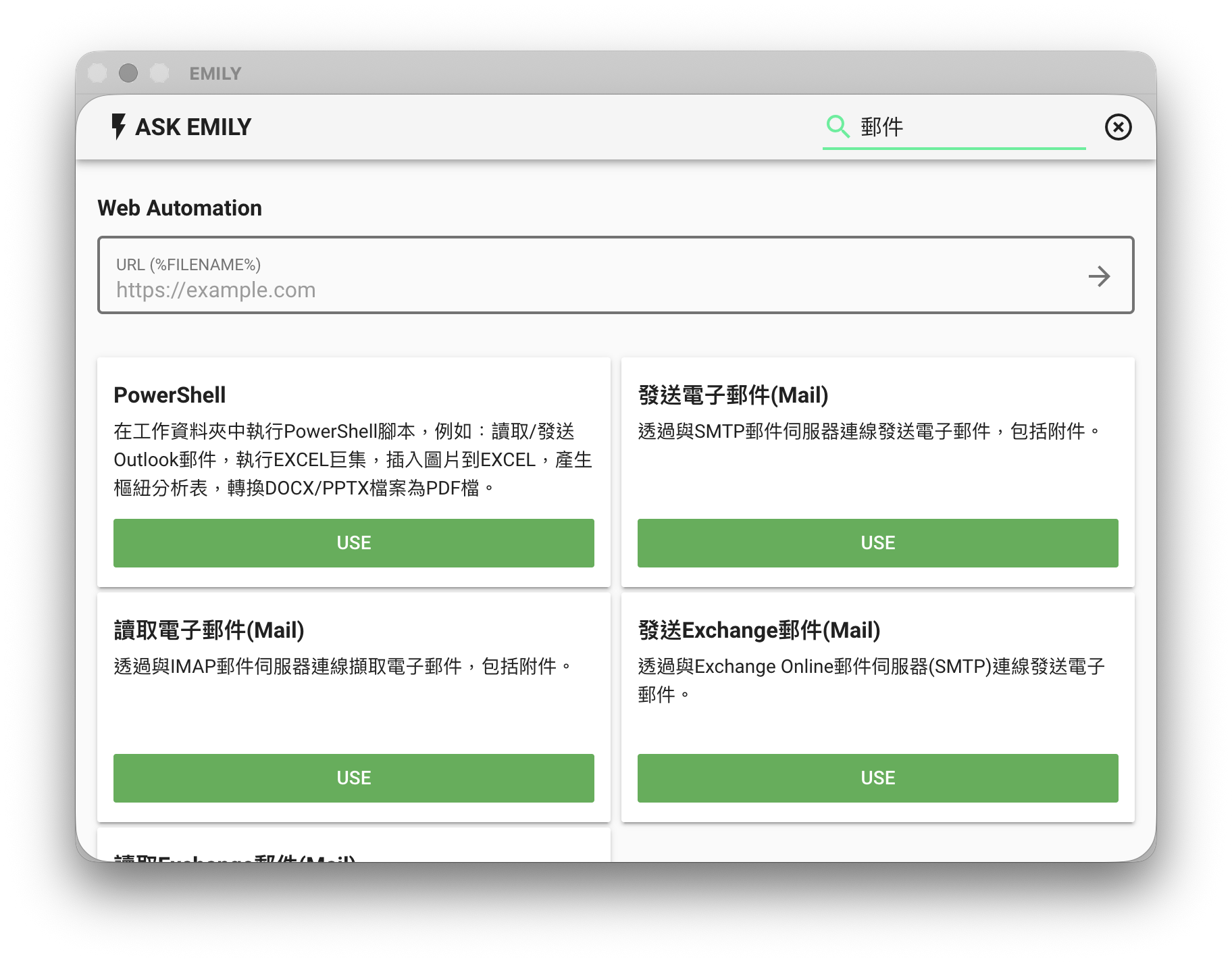 設計首頁可以上下捲動,瀏覽所有的自動化模組。右上方有個快搜,填入搜尋關鍵字時會即時過濾出名稱與說明包含關鍵字的所有模組,例如輸入 郵件 會過濾出跟郵件有關的模組。