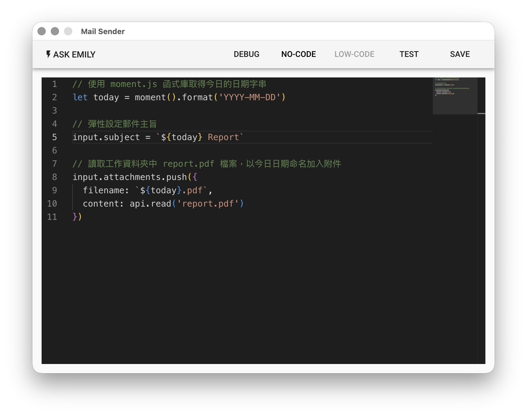 需要高度彈性或複雜規則的模組通常會另外提供 Low-Code 低程式碼編輯器,例如發送電子郵件」郵件主旨與附件檔案想以當天日期做命名,這時就可以採用 Low-Code 以 JavaScript 編寫彈性的規則。moment.js 與 lodash 都是內建函式庫,可以直接使用。模組執行時會先將無程式碼指令依序執行完畢再執行低程式碼中的腳本。