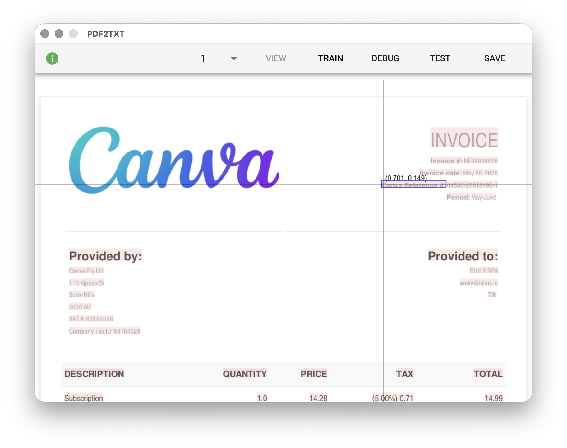 「VIEW」輔助編輯器可以在文件預覽畫面上以滑鼠鍵盤的組合操作來產生 Low-Code 需要的程式碼。在輔助編輯器中將滑鼠移到頁面文字上可以標示文字物件與座標,另外也可以透過滑鼠與鍵盤的組合操作來自動產生程式碼,使用者在完成操作後產生的程式碼會被存在剪貼簿中,可以切換到 Low-Code 編輯器中直接貼上,或進一步修改。
