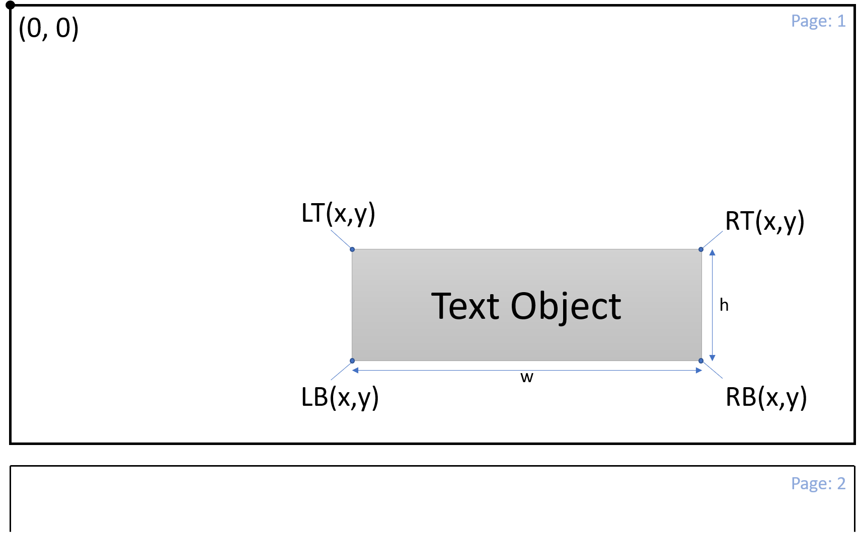 模組中使用 Page Normalized Coordinate(PNC) 座標系統。原點位於文件第一頁的左上角 (0,0),每一頁的座標範圍正規化至相鄰的整數。座標以 (x,y) 表示,其中 x 或 y 都可以帶小數,第一頁的座標範圍是 (0,0) 至 (1,1),第二頁則是 (0,1) 至 (1,2) 依此類推,例如 (0.5,1.5) 代表座標在第二頁的正中間。