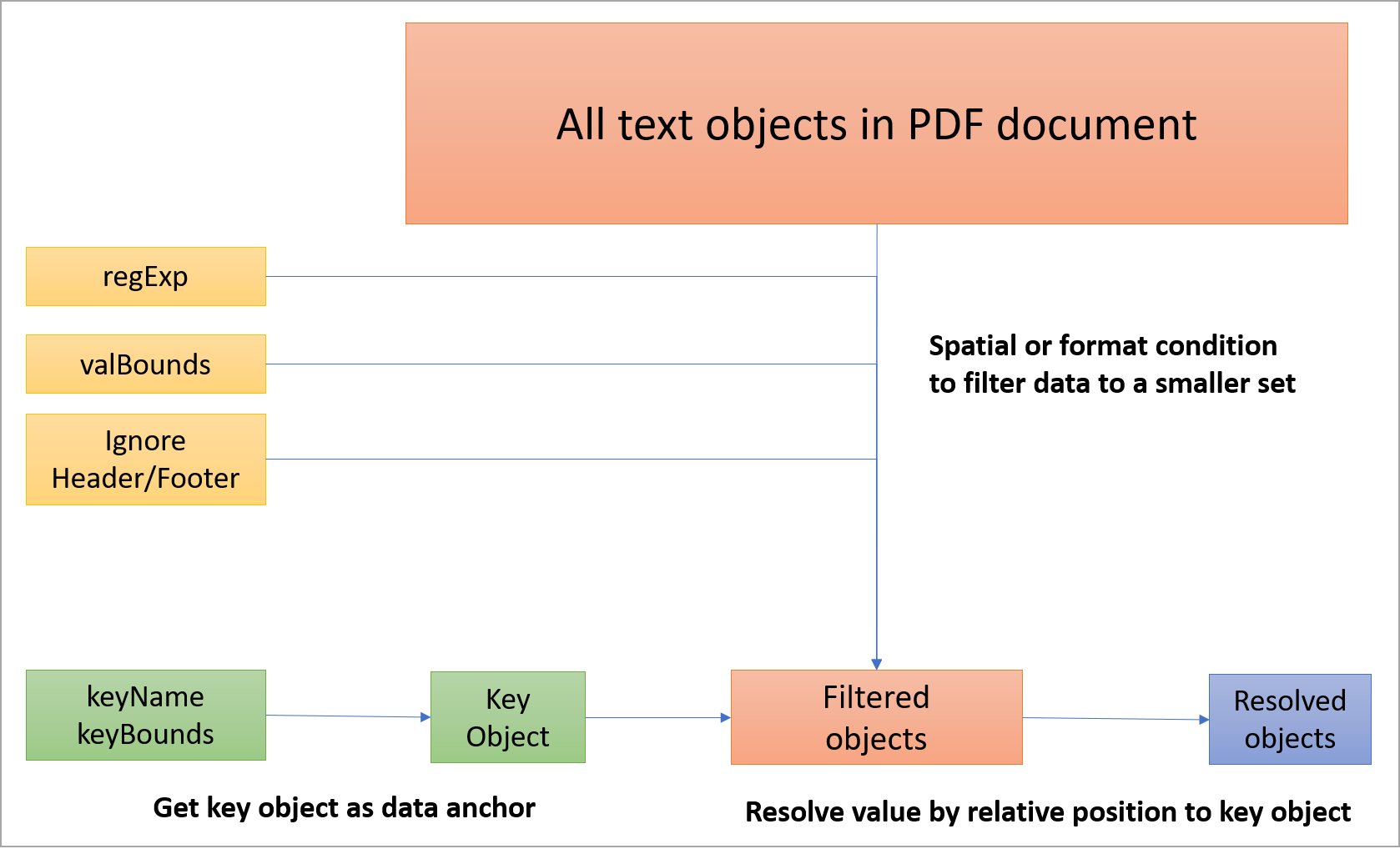 輸入物件提供了數個解析函式與工具函式能幫助使用者在空間中找出目標物件。整體的解析邏輯在於使用空間(spatial)或字詞(textual)上的條件縮小文字物件的集合,接著用相對關係找到目標物件。
