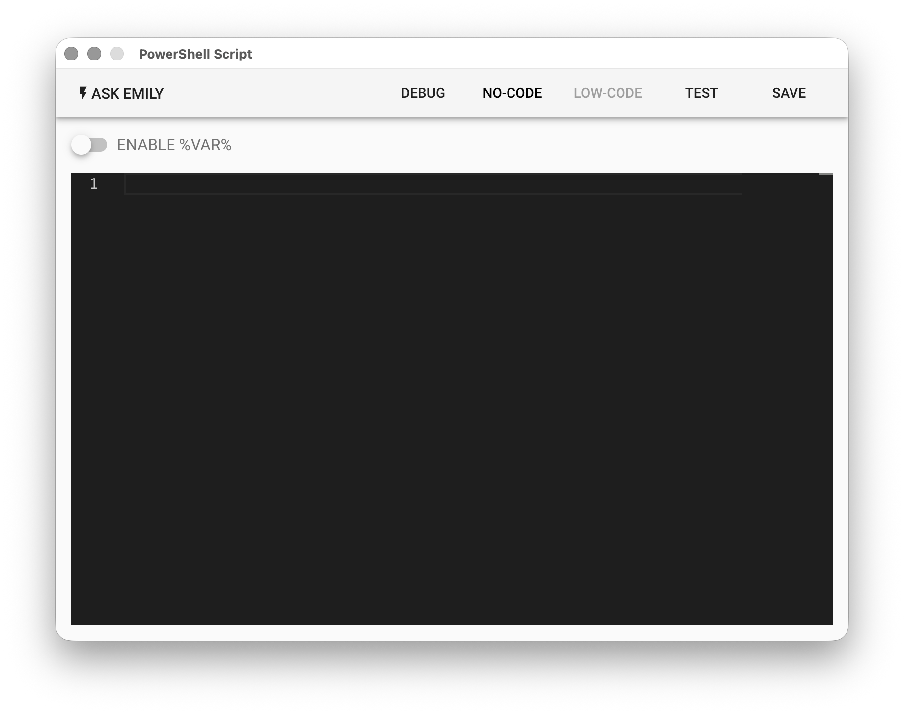 在開啟 %VAR% 功能下,應避免在腳本註解(# 開頭)中出現百分比符號%。Low-Code 編輯器只支援命令(Cmdlet)序列執行,即從上至下按照順序逐行命令執行。如果需要進一步達成流程控制例如 for, foreach, if, switch, while, until 等指令,需要將腳本存成 ps1 檔案,再於 Low-Code 中呼叫: