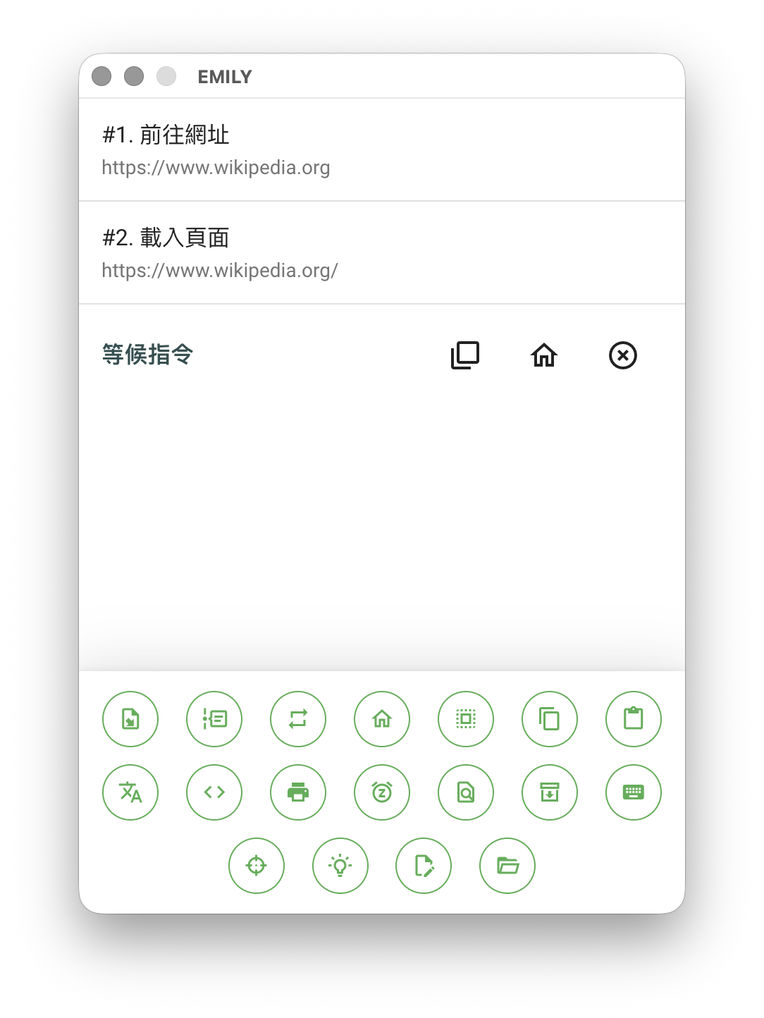 以滑鼠在瀏覽器頁面中選擇目標節點並輸入提示文字,在執行時期 EMILY 機器人到了這個步驟會暫停自動執行,並以紅色標識節點,同時主視窗顯示提示文字來引導用戶接手操作頁面,完成後點擊「完成了」讓機器人繼續自動執行。